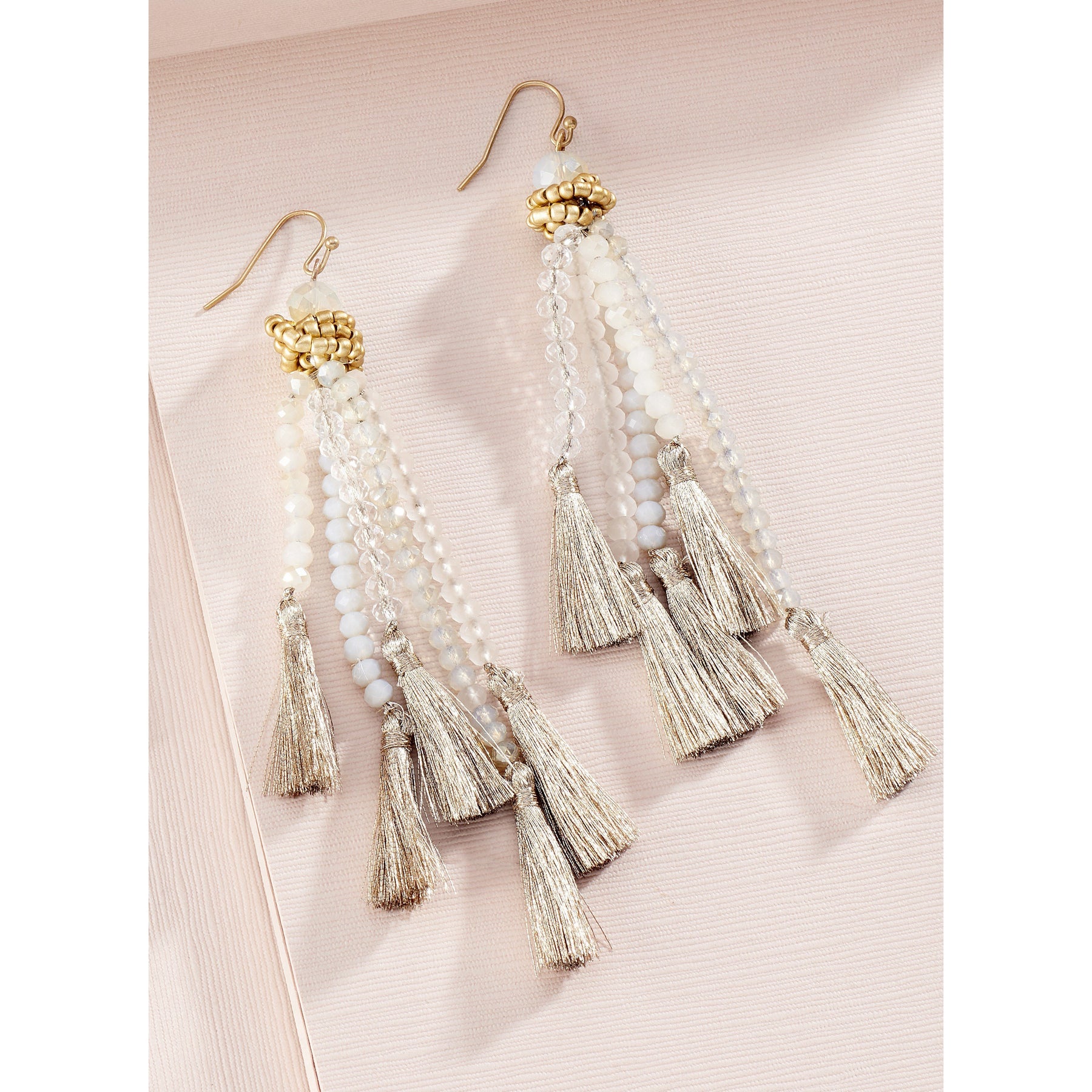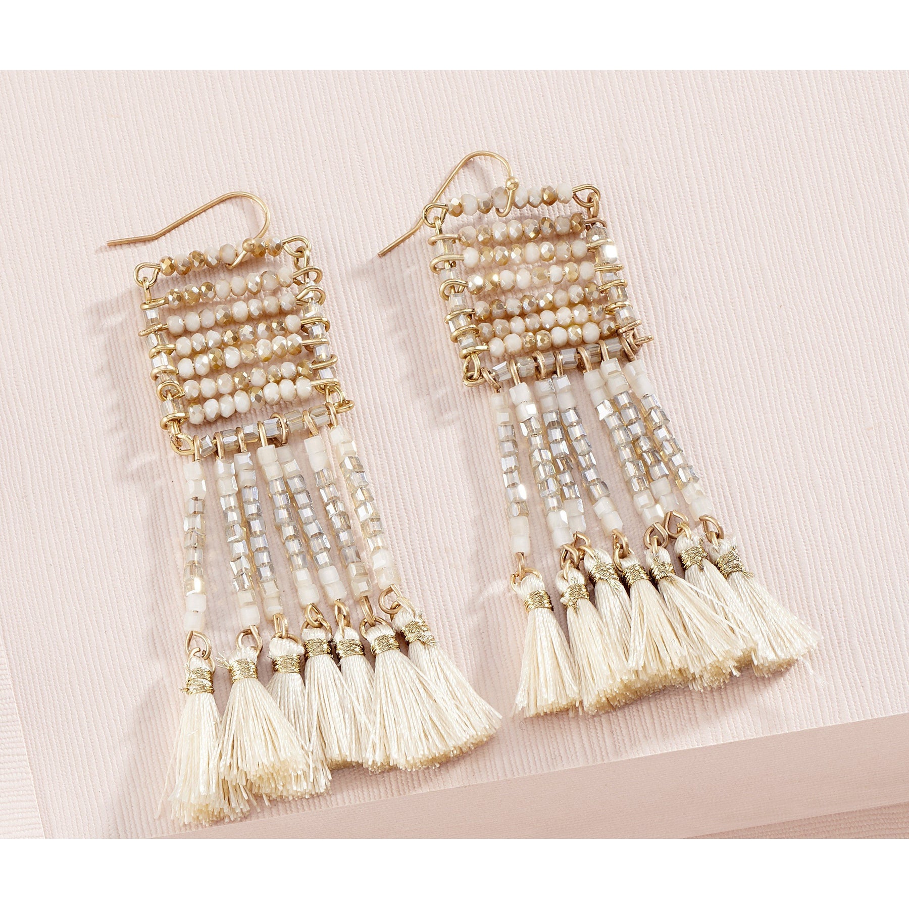 Go bold with your accessories with these gold dangling earrings, featuring tassels and/or beads. 4 Assorted Designs.