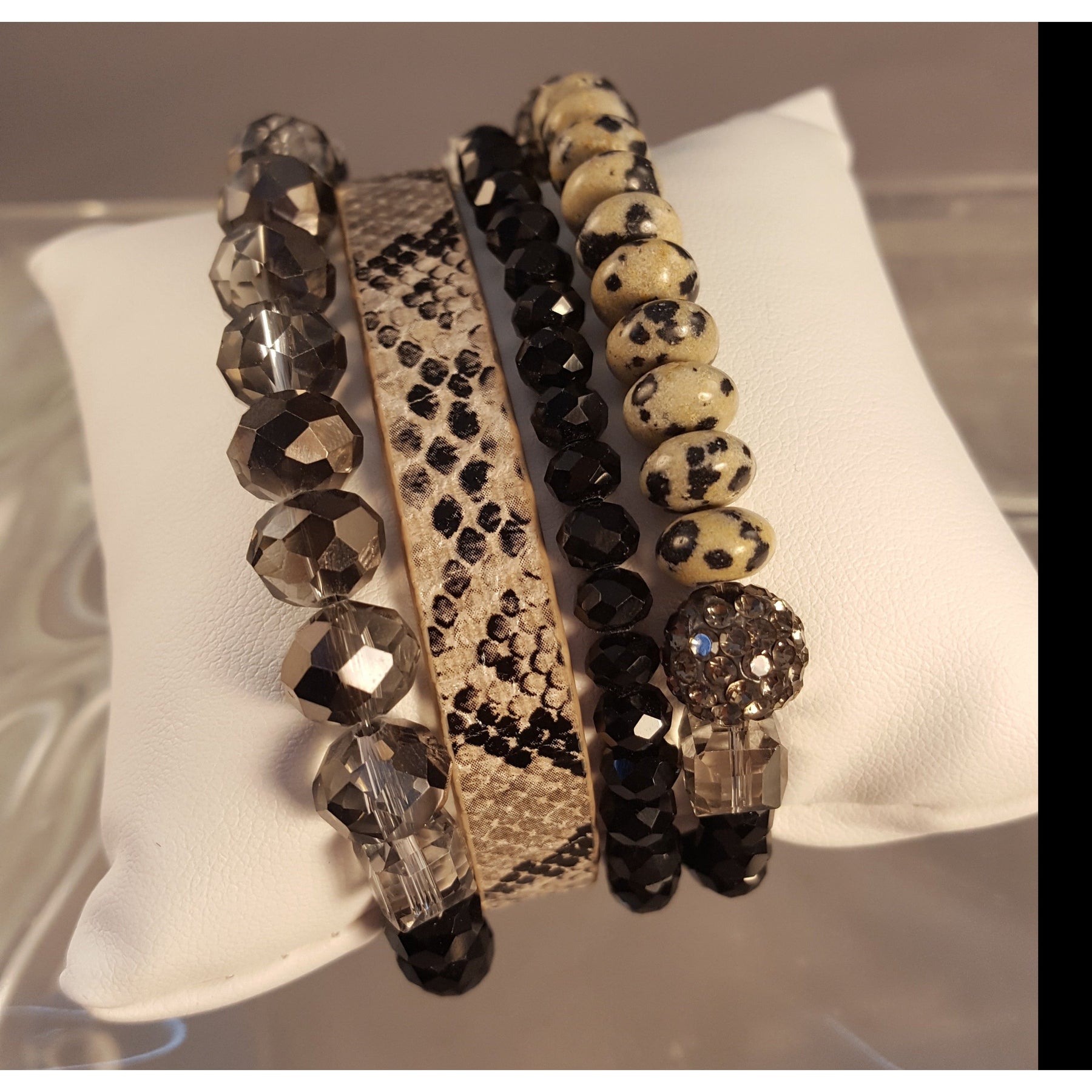 The leather bracelet has a magnetic closure and the beaded bracelets are stretchable.