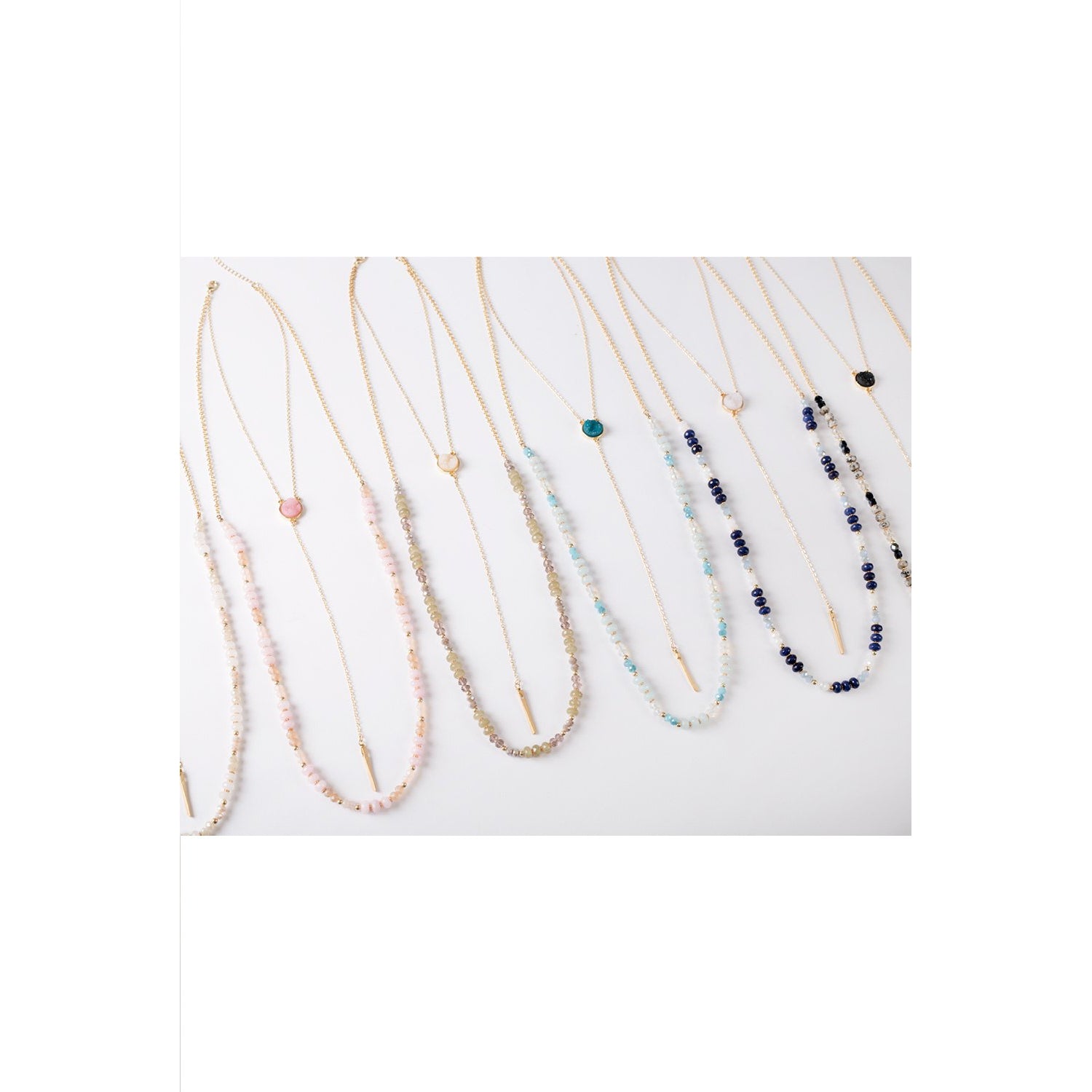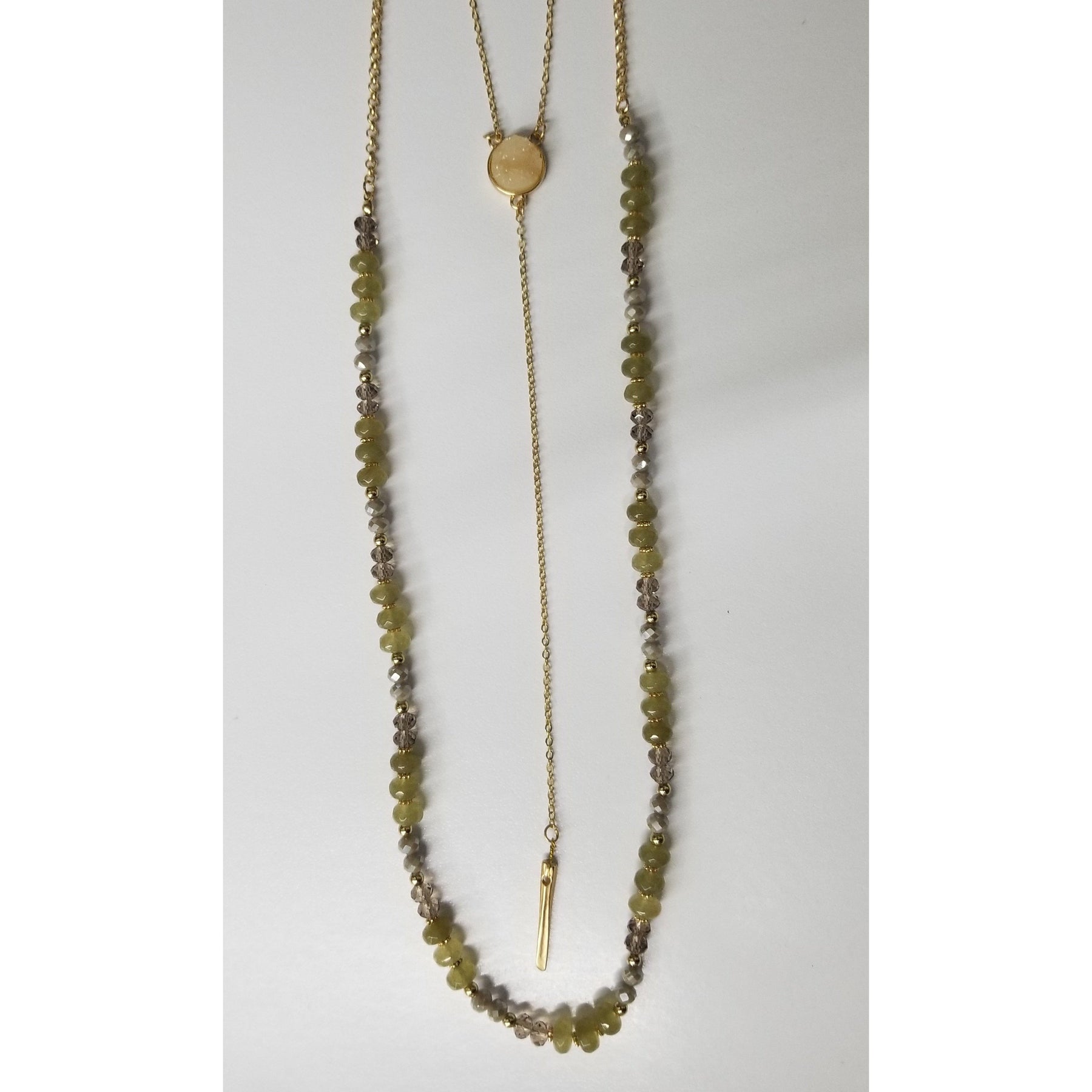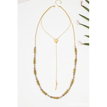 Regular price Save $-32.99This beautiful necklace has a base metal with semi precious stones and faceted glass fire beads that adjusts from 38" to 41".