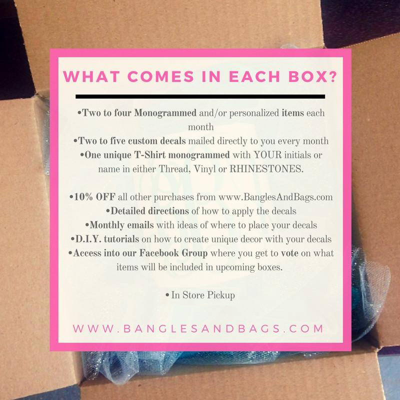 The two to five decals that also come each month in your monthly monogram box subscription come in: solid color options, glitter and Lilly Pulitzer inspired prints and even RHINESTONES! Decal sizes will range from multiple mini decals a month to our extra large decals, or a mixture of various sizes. You will receive a variety of colors and prints specially chosen each month for you. You will receive some of the most popular fonts and decal styles from The Monthly Monogram Subscription by Bangles And Bags and subscribers will have the opportunity to vote on what they want to see in the next box too via the limited access FACEBOOK GROUP!