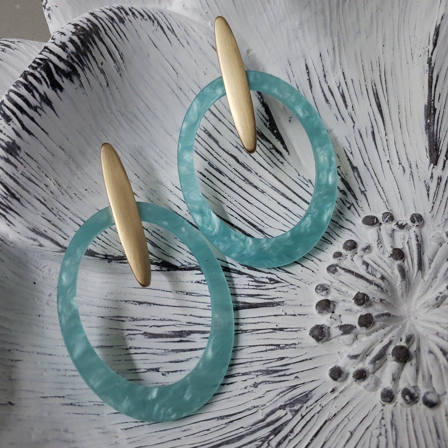 The oval shaped teal earring has a gold colored bar that holds them to your ear. No clip ons are available.