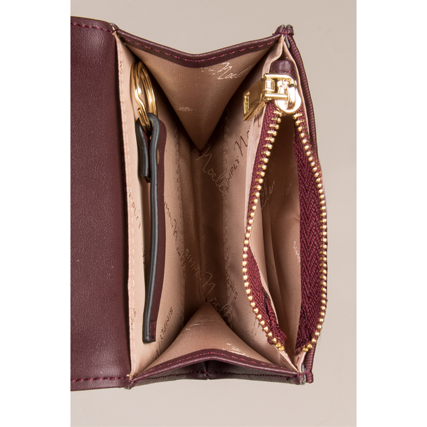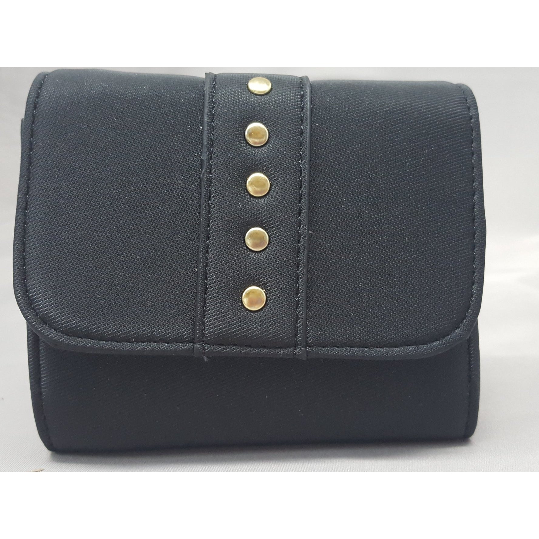 Regular price Save $-32.99This wallet is a sleek nylon like body with bold rivet details. The hardware is shiny gold and there is an exterior snap closure and a back ID slot